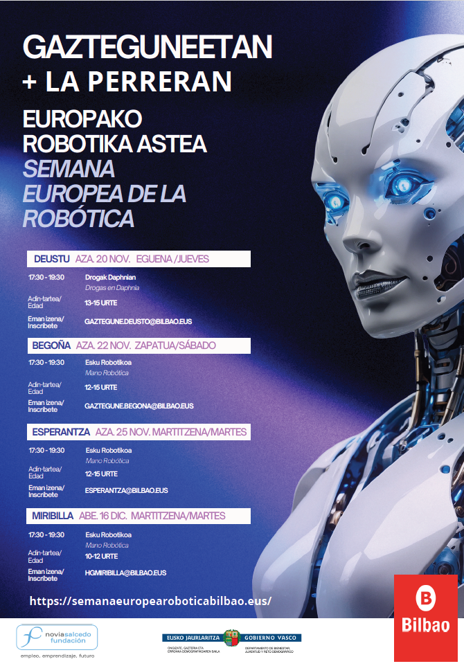 Este año la Fundación Novia Salcedo participamos en la Semana Europea de la Robótica, acercando actividades científicas y tecnológicas a jóvenes de Bilbao. En colaboración con Biook , y con el apoyo del Ayuntamiento de Bilbao y del Gobierno Vasco — Departamento de Bienestar, Juventud y Reto Demográfico, impulsamos una propuesta educativa que combina divulgación, experimentación y acompañamiento a las vocaciones científicas.